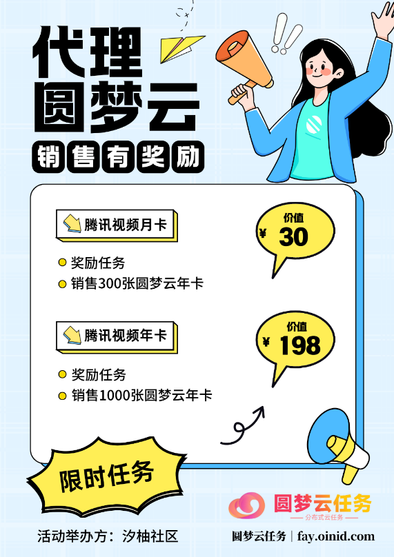 圆梦云任务:fay.oinid.com 活动规则:在本社区发帖展示“使用圆梦云代挂服务”并展示或说明使用效果 最后留下用户名即可获得年卡